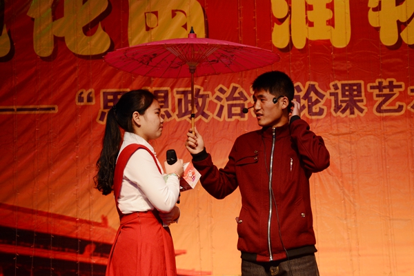 本次匯報演出活動由馬克思主義基本原理教研室主任教師武曉婕總體策劃,所有演員均來自于其任課的2015級6個班級?;顒硬扇∮纱n教師在開學初確定主題,學生自己收集資料,學生自編自導自演,代課教師加以輔導的方式進行,準備工作前后耗時一個多月。演出將思想政治理論課的教學內(nèi)容與藝術方法有機結(jié)合,演出節(jié)目包括情景劇、三句半、歌曲聯(lián)唱、故事講述、詩歌朗誦等多種形式,演出中間穿插憲法知識問答環(huán)節(jié)。情景劇選取與大學生密切相關的生活片斷,真摯感人,引人深思;三句半用曲藝的形式,謳歌法治中國的建設,引導人們關注交通安全;歌曲聯(lián)唱顯現(xiàn)了當代大學生與時代同呼吸共命運,心懷感恩勇于擔當?shù)那閼眩还适轮v述再現(xiàn)了最美中國人的風采,講者動容聽者動情;詩歌朗誦帶領大學生品味愛情,感悟人生。演出中演員表演形象逼真,動作到位,神態(tài)自然大方;現(xiàn)場觀眾如同身臨其境,忽而感動落淚,忽而會意微笑。演出豐富了校園文化生活,起到了用藝術熏陶進行思想啟迪,潛移默化教育的良好效果。
