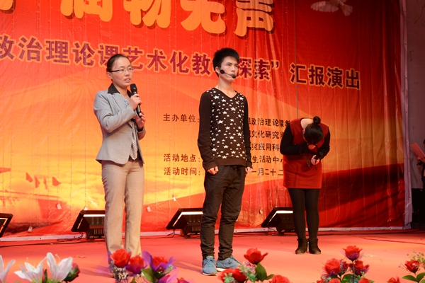 長期以來,圍繞如何不斷增強思政課的實效性,不斷改善思政課的課堂教學效果,不斷創(chuàng)新思政課的實踐教學模式,思政部全體教師認真貫徹落實《中共中央宣傳部、教育部關于進一步加強和改進高等學校思想政治理論課的意見》的有關精神,不斷加強教學方法研究,不斷優(yōu)化教學手段,為把思想政治理論課建設成為大學生真心喜愛、終身受益的課程而不懈努力,進行了全方位的探索。本次“春風化雨潤物無聲——思想政治理論課藝術化教學探索”匯報演出以“思想政治理論課生命課堂實踐體系構(gòu)建研究”、“社會主義核心價值觀視域下高校思想政治理論課實踐教學模式的創(chuàng)新與實踐研究”、“雙向案例教學法在高?!颊n’中的應用”等三個陜西省教育科學規(guī)劃課題為依托,是對我校思政課教學方法改革探索的一次有益嘗試。