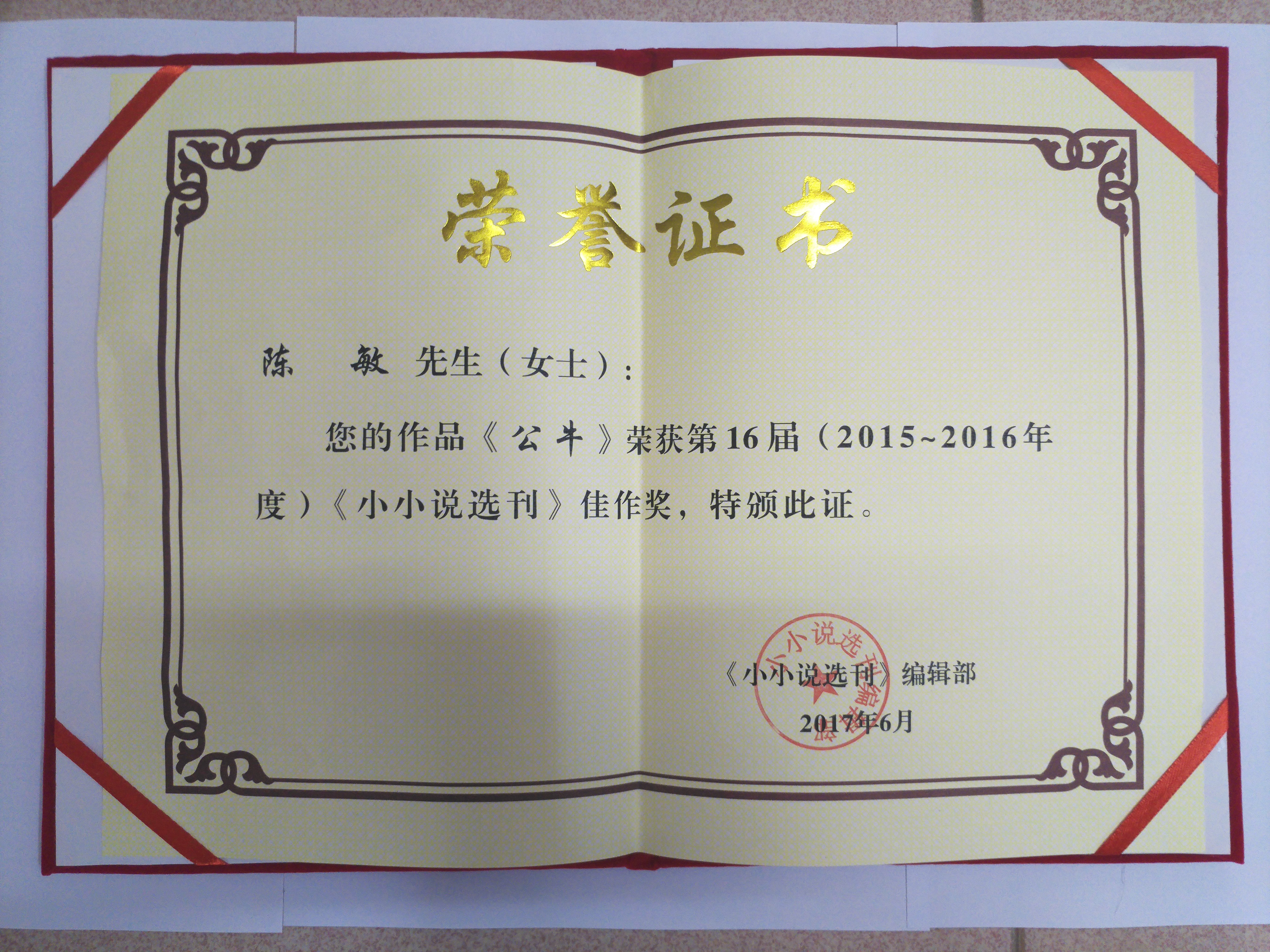 近日,由人民文學(xué)出版社、中國小說學(xué)會(huì)、河南省作家協(xié)會(huì)、河南省文學(xué)院、鄭州市文聯(lián)主辦,鄭州小小說文化傳媒有限公司、《小小說選刊》《百花園》承辦的第16屆(2015-2016年度)《小小說選刊》優(yōu)秀作品頒獎(jiǎng)典禮在鄭州舉行。我校教師陳敏的小說《公?!吩诮f余篇的參評小小說中獲得第16屆《小小說選刊》佳作獎(jiǎng),這是陳敏繼獲第九屆(2001-2002年度)《小小說選刊》優(yōu)秀作品獎(jiǎng)(《詩祭》)之后的第二次獲獎(jiǎng)。