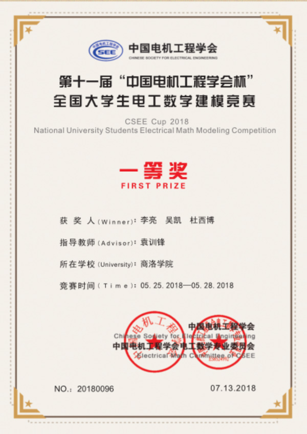 近日,中國電機工程學(xué)會電工數(shù)學(xué)專委會主辦的“第十一屆電工杯數(shù)學(xué)建模競賽”和江蘇省工業(yè)與數(shù)學(xué)應(yīng)用學(xué)會主辦的“第十五屆五一數(shù)學(xué)建模競賽”比賽結(jié)果揭曉,由我校學(xué)生李亮、吳凱、杜西博組成的參賽隊伍獲得第十一屆“電工杯”數(shù)學(xué)建模競賽一等獎,這是我校學(xué)生首次獲得電工杯數(shù)學(xué)建模競賽全國一等獎。此外,我校參賽學(xué)生還在這兩個比賽中獲得國家級二等獎2項、三等獎6項,省級二等獎2項、三等獎6項的好成績。