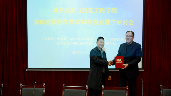 10月31日,城鄉(xiāng)規(guī)劃與建筑工程學院兼職教授聘任暨2018年教育教學研討會順利舉行,西安建筑科技大學白國良教授在會上受聘為我校兼職教授。校長范新會出席聘任儀式并為白教授頒發(fā)聘書。校黨委委員、教務(wù)處處長李超,校黨委委員、城鄉(xiāng)規(guī)劃與建筑工程學院院長楊存典及人事處相關(guān)負責人參加了聘任儀式。聘任儀式由李超主持。