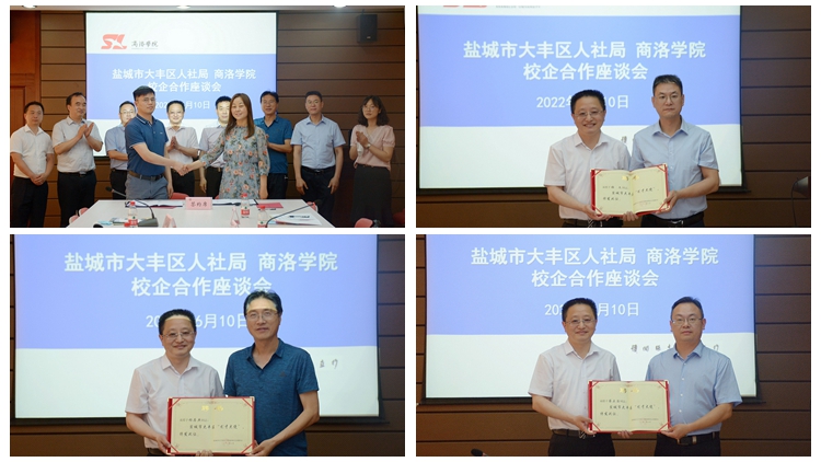 會上,張強(qiáng)為“鹽城市大豐區(qū)商洛學(xué)院引才工作站”授牌,并為楊存典、蔣正治和學(xué)生處副處長張文頒發(fā)了鹽城市大豐區(qū)“引才大使”聘書。楊存典與張強(qiáng)分別代表學(xué)校和大豐區(qū)簽署校地合作協(xié)議。馬克思主義學(xué)院黨總支書記劉麥霞與企業(yè)代表簽署校企合作協(xié)議。