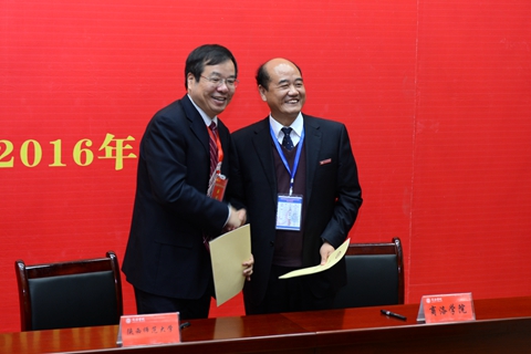 10月23日,在商洛學(xué)院創(chuàng)建一流應(yīng)用型本科院校動員大會上,我校與陜西師范大學(xué)簽訂《戰(zhàn)略合作協(xié)議》,黨委書記、校長劉建林與陜西師范大學(xué)副校長黨懷興代表雙方在協(xié)議書上簽字。