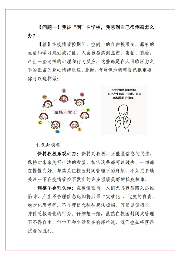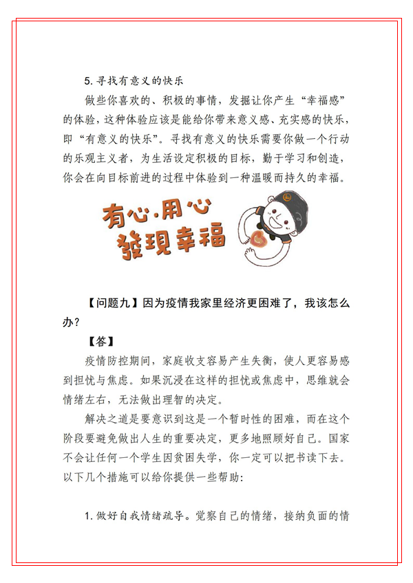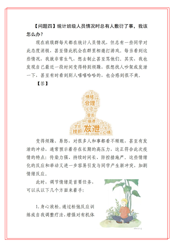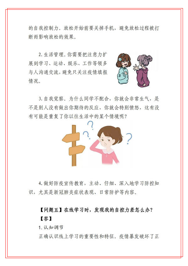 為切實(shí)貫徹學(xué)校黨委關(guān)于做好本輪新冠肺炎疫情防控工作的安排部署,堅(jiān)決打贏疫情防控阻擊戰(zhàn),健康管理學(xué)院積極發(fā)揮學(xué)科專業(yè)和人才優(yōu)勢(shì),組織心理學(xué)系教師迅速行動(dòng),針對(duì)防疫期間大學(xué)生常見的心理健康問題,編寫了《商洛學(xué)院大學(xué)生防疫心理健康你問我答》。這些心理健康科普知識(shí)緊密結(jié)合我校師生實(shí)際,圖文并茂、通俗易懂,能夠有效幫助和引導(dǎo)廣大學(xué)生調(diào)試自己心理狀態(tài),維護(hù)身心健康。