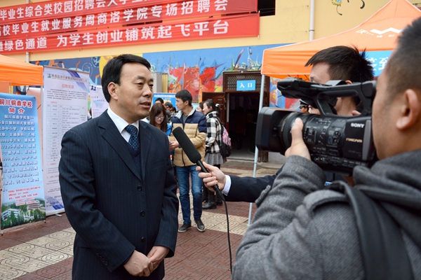 彭虎軍在招聘會期間接受了電視臺專訪。他指出,我校一貫重視大學(xué)生就業(yè)工作,通過落實完善就業(yè)創(chuàng)業(yè)政策,加大資金投入,積極促進(jìn)大學(xué)生自主創(chuàng)業(yè)。不斷加強(qiáng)大學(xué)生就業(yè)服務(wù)和指導(dǎo),以舉辦就業(yè)形勢與政策報告會、邀請就業(yè)創(chuàng)業(yè)專家進(jìn)校園等方式宣傳大學(xué)生就業(yè)政策,促進(jìn)大學(xué)生就業(yè)觀念的轉(zhuǎn)變。通過舉辦各類招聘會促進(jìn)大學(xué)生就業(yè),近期連續(xù)舉辦了4場招聘會,提供就業(yè)崗位6000多個。他表示,有黨和政府促進(jìn)大學(xué)生就業(yè)的良好政策,有社會各界的大力支持,有廣大學(xué)生的積極努力,我校畢業(yè)生一定能夠?qū)崿F(xiàn)更充分更高質(zhì)量的就業(yè)創(chuàng)業(yè)。