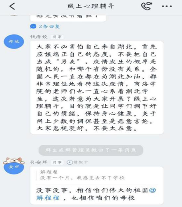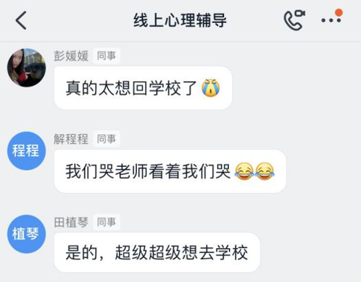 輔導(dǎo)會(huì)開展過程中,學(xué)生們積極參與討論,很多學(xué)生表示“超級(jí)超級(jí)想去學(xué)?!薄爸幌肴ド蠈W(xué)”,當(dāng)然學(xué)生們也會(huì)擔(dān)憂自己回學(xué)校就被隔離了,擔(dān)心因?yàn)樽约菏呛比硕艿酱蠹业漠悩友酃?。輔導(dǎo)老師針對學(xué)生的這些焦慮、恐懼等負(fù)性情緒進(jìn)行了線上輔導(dǎo),學(xué)生們表示“相信咱們的母校、相信咱們偉大的祖國”。