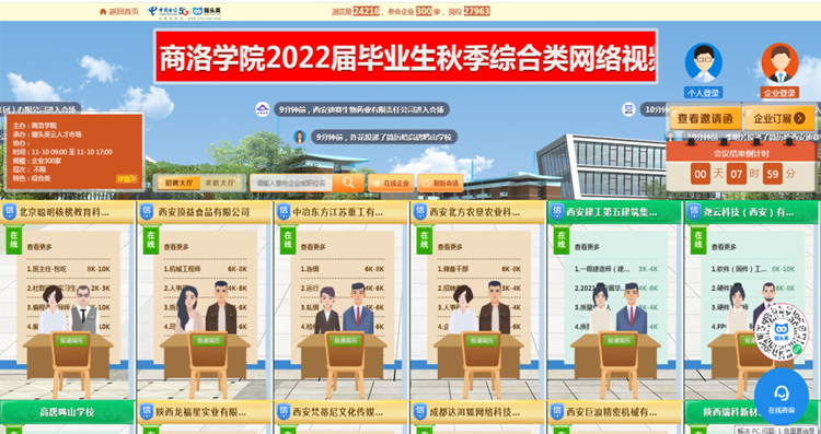 本次網(wǎng)絡(luò)視頻招聘會共有西安建工第五建筑集團(tuán)有限公司、中航鋰電科技有限公司、北京聰明核桃教育科技有限公司、永壽高新醫(yī)院等省內(nèi)外300家用人單位參會;提供涉及文體教育、IT通信、醫(yī)療衛(wèi)生、建筑工程、信息服務(wù)、機(jī)電制造等9大行業(yè)領(lǐng)域的就業(yè)崗位2萬余個;吸引了近2000余名校內(nèi)外畢業(yè)生參會,累計投遞簡歷3239份。