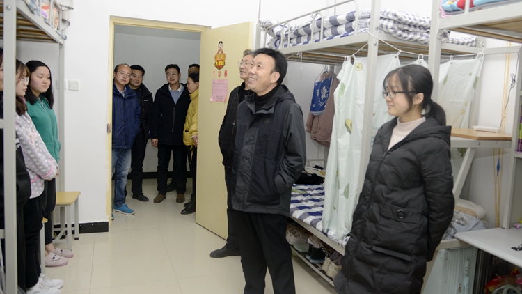 檢查中,彭虎軍詳細查看了公寓出入學生登記冊、輔導員進樓走訪工作臺賬及輔導員值班安排表,并就公寓管理、宿舍文明、宿舍衛(wèi)生、學生教育管理等工作與宿管員及值班輔導員進行了深入交流。在學生宿舍,彭虎軍仔細查看了宿舍環(huán)境、設施安全及衛(wèi)生情況,與學生們親切交談,詢問他們學習生活中的困難和需求、就業(yè)意向及宿舍供暖情況等,叮囑學生要提高安全意識,注意冬季用電安全,遵守公寓安全相關規(guī)定,營造良好的學習和生活環(huán)境。彭虎軍還要求相關部門及二級學院要進一步加強安全隱患排查整治工作,形成常態(tài)化工作機制,解決好突出問題,充分保障學校安全穩(wěn)定大局,確保正常的教育教學秩序。