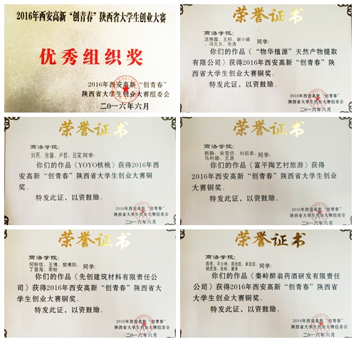 6月2日,2016年西安高新“創(chuàng)青春”陜西省大學生創(chuàng)業(yè)大賽頒獎典禮在西北大學舉行。我校學生的《秦嶺醉翁藥酒研發(fā)有限責任公司》《先創(chuàng)建筑材料有限責任公司》《商洛YOYO核桃觀光工廠》《陜西富平陶藝村專線旅游服務》《物華植源天然產物提取有限公司》等五個項目榮獲銅獎,學校獲得“優(yōu)秀組織獎”。