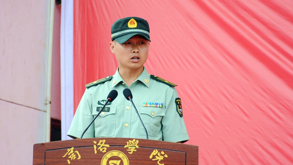 副校長(zhǎng)劉勇在講話中指出,軍訓(xùn)是大學(xué)生提高政治覺悟,激發(fā)愛國(guó)熱情,增強(qiáng)國(guó)防觀念和組織紀(jì)律性的大熔爐。14天來,同學(xué)們用信念和毅力鑄就了良好作風(fēng),展示出了堅(jiān)韌不拔的優(yōu)秀品質(zhì)和團(tuán)結(jié)拼搏的集體精神,學(xué)校和老師們對(duì)他們?cè)谖磥硭哪昀镯樌砷L(zhǎng)充滿信心,為他們感到驕傲和自豪!劉勇寄語(yǔ)2017級(jí)學(xué)生,要繼續(xù)發(fā)揚(yáng)軍隊(duì)的光榮傳統(tǒng)和優(yōu)良作風(fēng),始終以軍人的標(biāo)準(zhǔn)嚴(yán)格自律,把不畏艱苦、頑強(qiáng)拼搏、勇于奉獻(xiàn)、敢于創(chuàng)新的精神融入靈魂,時(shí)刻牢記肩負(fù)的歷史使命與責(zé)任,樹立為中華民族偉大復(fù)興中國(guó)夢(mèng)貢獻(xiàn)力量的信心與決心,成為無愧于時(shí)代的有理想、有擔(dān)當(dāng)、有作為的合格大學(xué)生!