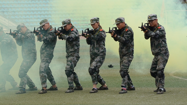 分列式結(jié)束后,我校學(xué)生進(jìn)行了花樣隊(duì)列、女子防身術(shù)、捕俘拳、捕俘刀、突擊演練與戰(zhàn)地救護(hù)、韻律操等匯報(bào)表演。伴隨著悠揚(yáng)的旋律,女兵們擺出了巨大的“中國(guó)”“喜迎十九大”等造型,祝福黨的十九大勝利召開。由男兵們表演的捕俘拳動(dòng)作精煉、氣勢(shì)磅礴,贏得了現(xiàn)場(chǎng)陣陣熱烈的掌聲。突擊演練與戰(zhàn)地救護(hù)展示了戰(zhàn)術(shù)手語(yǔ)、戰(zhàn)術(shù)隊(duì)形和破襲戰(zhàn)斗等,同學(xué)們配合密切、組織嚴(yán)謹(jǐn),展示了良好的戰(zhàn)斗技能和戰(zhàn)術(shù)素養(yǎng),將現(xiàn)場(chǎng)氣氛推向了高潮。