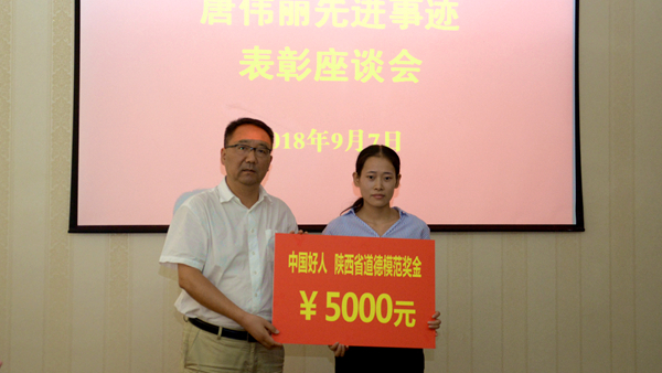 龍治剛代表學(xué)校向唐偉麗頒發(fā)5000元獎(jiǎng)金。彭虎軍宣讀了《中共商洛學(xué)院委員會(huì)關(guān)于向“中國(guó)好人”“陜西省第五屆道德模范”唐偉麗同學(xué)學(xué)習(xí)的通知》。