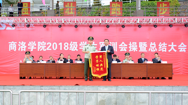 大會在莊嚴(yán)雄壯的國歌聲中拉開帷幕。校黨委書記龍治剛對全體承訓(xùn)教官不畏風(fēng)雨、認(rèn)真負(fù)責(zé)、辛勤努力的付出表示感謝,并代表學(xué)校向中國人民武警部隊商洛支隊贈送了寫有“軍人典范 學(xué)子楷模”的錦旗。