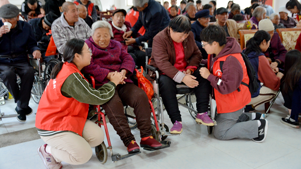 為傳承中華民族尊老愛(ài)老的傳統(tǒng)美德,弘揚(yáng)“奉獻(xiàn)、友愛(ài)、互助、進(jìn)步”的志愿精神,10月14日,在重陽(yáng)節(jié)即將來(lái)臨之際,校團(tuán)委和商洛市慈善協(xié)會(huì)組織我校青年志愿者協(xié)會(huì)、馬克思主義學(xué)院志愿服務(wù)隊(duì)百余名志愿者赴百順山莊老年公寓開(kāi)展“九九重陽(yáng)節(jié) 濃濃敬老情”志愿服務(wù)活動(dòng)。志愿者們幾人一組,攙扶老人下樓散心,幫他們推輪椅,陪他們聊天、講笑話(huà)、唱歌,為他們包餃子,叮囑他們照顧好身體,并貼心送上暖手寶,讓他們感受到更多來(lái)自社會(huì)和青年人的溫暖與關(guān)懷。志愿者們還精心準(zhǔn)備了《雙截棍》《拍拍操》《漢服舞》《映山紅》等文藝表演,為老人們帶去歡笑與快樂(lè)。公寓的老人們也動(dòng)情地演唱了紅歌,幸福之情溢于言表。溫暖人心的志愿活動(dòng)展現(xiàn)了我校學(xué)子尊老愛(ài)老的道德品質(zhì),增強(qiáng)了新時(shí)代青年人孝老愛(ài)親的內(nèi)在自覺(jué),堅(jiān)定了青年志愿者們持之以恒尊老助老的信念決心。