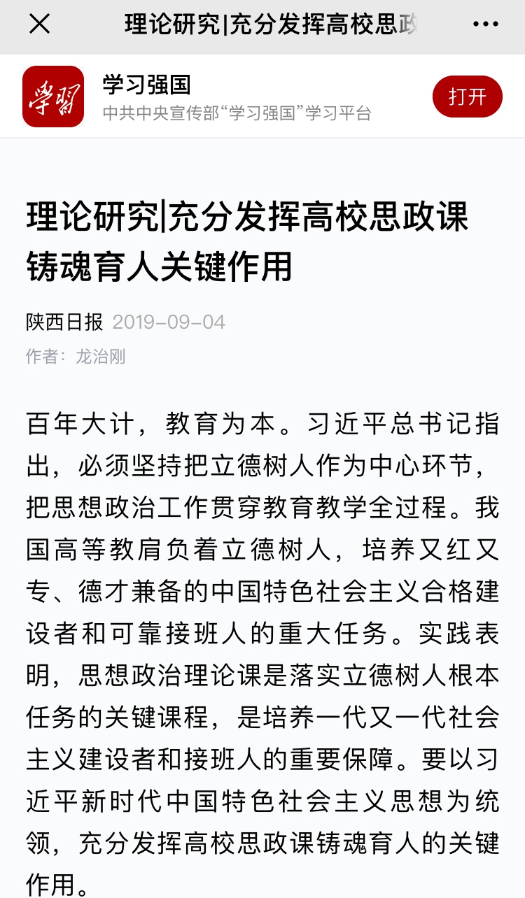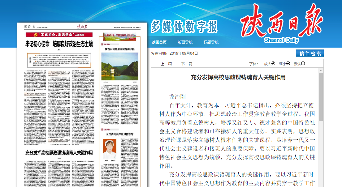 黨委書記龍治剛在《陜西日報(bào)》2019年9月4日第6版發(fā)表理論文章《充分發(fā)揮高校思政課鑄魂育人關(guān)鍵作用》,學(xué)習(xí)強(qiáng)國平臺(tái)全文轉(zhuǎn)載。文章內(nèi)容如下: