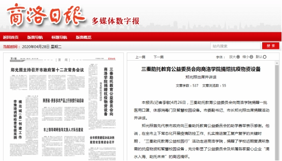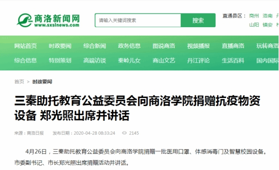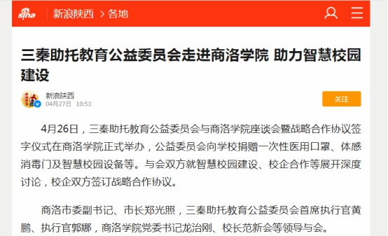 近日,陜西廣播電視臺(tái)、陜西省教育廳網(wǎng)站、西部網(wǎng)、華商網(wǎng)、新浪網(wǎng)、搜狐網(wǎng)、《商洛日?qǐng)?bào)》、商洛市人民政府網(wǎng)站、頭條新聞、中華網(wǎng)等省市10余家媒體及部分自媒體平臺(tái)對(duì)三秦助托教育公益委員會(huì)向我校捐贈(zèng)防疫物資和智慧校園設(shè)備的情況進(jìn)行了廣泛宣傳報(bào)道。