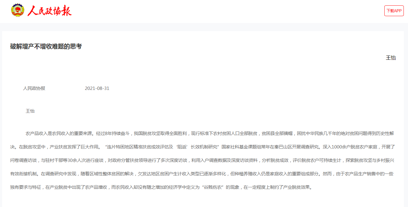 《人民政協(xié)報》2021年8月31日刊發(fā)了我校陜西高校新型智庫商洛發(fā)展研究院院長王怡署名文章《破解增產(chǎn)不增收難題的思考》,對文章中的國家社科基金項目“連片貧困地區(qū)精準扶貧成效評估及‘阻返’長效機制研究”的研究成果做了專題報道。