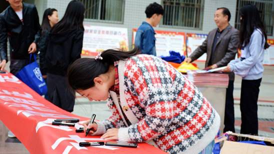 商洛學(xué)院學(xué)生在宣傳橫幅上簽名