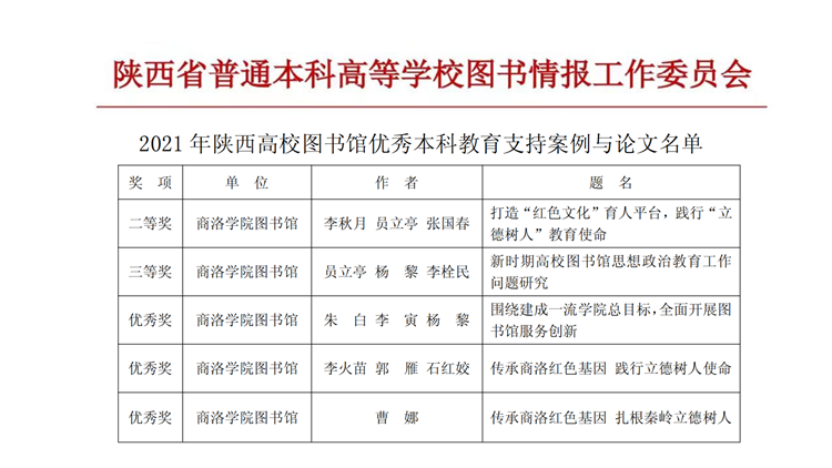 由陜西省高校圖工委主辦的“2021年陜西高校圖書館本科教育支持案例與論文大賽”結(jié)果于日前揭曉,圖書館館員李秋月獲二等獎,員立亭獲三等獎,朱白、李火苗和曹娜等人獲優(yōu)秀獎。