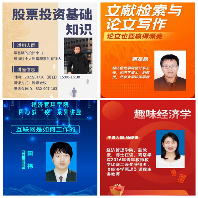 開展公益講座,倡導師生健康生活學習。學院圍繞疫情防控要求和學院專業(yè)特色,持續(xù)推出師生關(guān)注度高的科普教育、文獻檢索、趣味經(jīng)濟學、個人理財、學科競賽等公益講座,倡導師生樹立科學健康的生活學習方式。