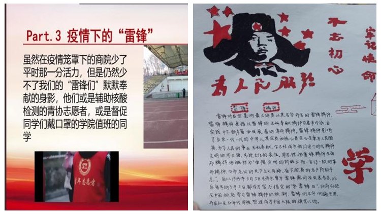 在“教育學(xué)習(xí)”上下功夫,將雷鋒精神注入學(xué)生心靈。學(xué)院通過微團(tuán)課、主題團(tuán)日活動(dòng)等形式組織廣大學(xué)生圍繞“學(xué)習(xí)雷鋒精神、抗擊疫情我先行”“如何踐行雷鋒精神”等話題開展討論;以“讀雷鋒日記、講雷鋒故事、畫學(xué)習(xí)板報(bào)”為載體,營造濃厚的學(xué)習(xí)氛圍,引導(dǎo)學(xué)生深刻領(lǐng)會(huì)雷鋒精神的實(shí)質(zhì)內(nèi)涵。