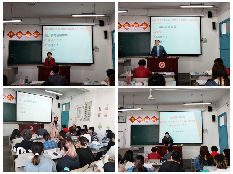 根據(jù)我校畢業(yè)生實(shí)習(xí)相關(guān)要求和學(xué)院工作安排。4月2日,健康管理學(xué)院召開應(yīng)用心理學(xué)專業(yè)2023屆畢業(yè)生教育實(shí)習(xí)動(dòng)員會(huì),62名實(shí)習(xí)生將奔赴商洛中學(xué)、商洛市小學(xué)等7所中小學(xué)校,開展為期12周的教育實(shí)習(xí)。黨總支書記魯綿茸出席會(huì)議并講話,實(shí)習(xí)指導(dǎo)教師、輔導(dǎo)員、2023屆應(yīng)用心理學(xué)專業(yè)全體畢業(yè)生參加動(dòng)員會(huì),會(huì)議由心理學(xué)系主任梁豐主持。