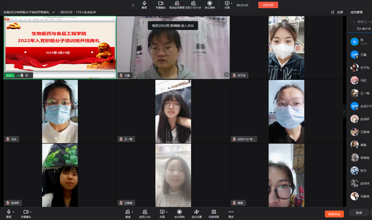 為切實做好入黨積極分子的培訓教育工作,進一步加深入黨積極分子對黨的認識,4月20日晚,生物學院依托線上平臺舉行2022年入黨積極分子培訓班開班典禮。院黨委副書記趙永平、學生各黨支部書記及120名培訓班學員參加開班典禮。典禮由學生第二黨支書記趙利君主持。