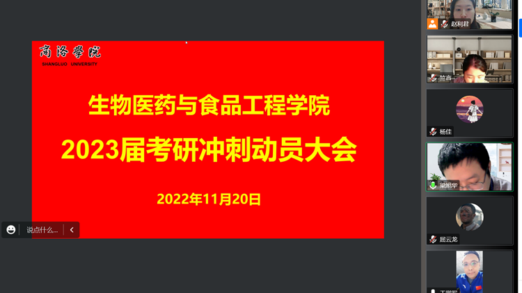 為了充分調(diào)動2023屆畢業(yè)生考研積極性,盡早明確考研目標與就業(yè)方向, 11月20日晚,生物學(xué)院通過釘釘線上平臺組織召開了2023屆考研沖刺動員大會。學(xué)院黨政領(lǐng)導(dǎo)、教師代表及2023屆考研學(xué)生參加會議。