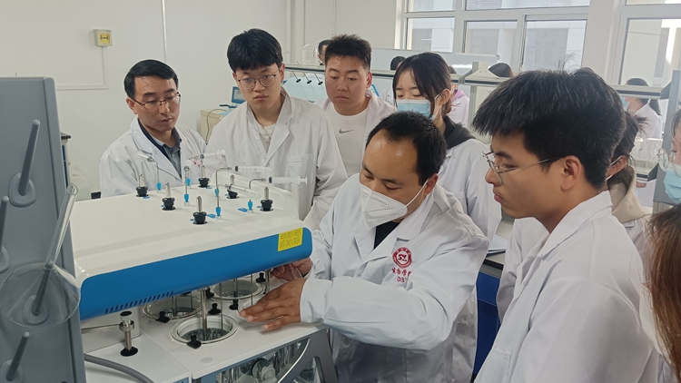 隨后,王學(xué)軍教授和周緒華老師帶領(lǐng)學(xué)生進(jìn)入實驗室,開展甲硝唑片溶出度的測定實踐。在實操的每一個環(huán)節(jié),兩位教師悉心指導(dǎo),學(xué)生自主實驗的同時與教師積極互動,詳細(xì)討論儀器操作的注意事項、出現(xiàn)的問題和解決的辦法,以及觀察的指標(biāo)、數(shù)據(jù)的收集與計算、結(jié)果的判定等實驗課程內(nèi)容。