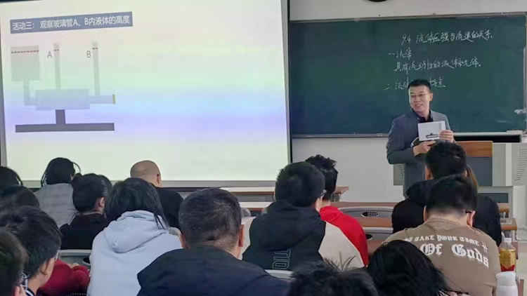 水江麗老師以《聚焦核心素養(yǎng),促進深度學習》為題作了專題學術報告,從核心素養(yǎng)重構未來教育藍圖、基于核心素養(yǎng)的教學設計和促進深度學習的教學建議三個方面闡述了中學物理教學中如何聚集核心素養(yǎng)培養(yǎng)、促進學生深度學習。柴勇勇老師在示范教學《流速與壓強的關系》一課講授中,從小實驗引入新課,通過圖片補充讓學生輕松接受流體的概念,再通過實驗讓學生總結得出科學結論,并運用結論解釋生活中的各種現象。