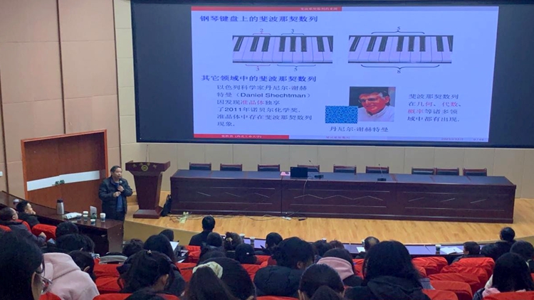 張勝貴教授以《斐波那契數(shù)列》為題,從數(shù)列的來源、與黃金分割的關系和應用等方面,完整、詳細地介紹了斐波那契數(shù)列。整場報告深入淺出,與會師生共同體驗斐波那契數(shù)列的美與價值。