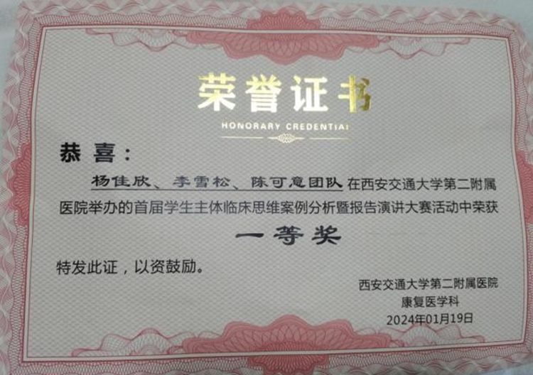 1月17日,西安交通大學(xué)第二附屬醫(yī)院舉辦首屆“明德知行,慎思醫(yī)道”學(xué)生主體臨床思維案例分析大賽總決賽。健康管理學(xué)院20級(jí)康復(fù)治療學(xué)專業(yè)實(shí)習(xí)生組隊(duì)參加,與眾多實(shí)習(xí)生、研究生和規(guī)培生同臺(tái)競(jìng)技。最終陳可意團(tuán)隊(duì)以冷靜的頭腦、精準(zhǔn)的判斷、深入的分析,流利的言語(yǔ)表達(dá)和形象的情景演繹,獲得一等獎(jiǎng)。
