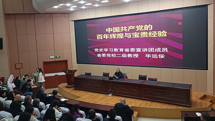 畢遠佞簡要介紹了自己的求學歲月、工作經(jīng)歷以及研究黨史的基本思路和方法。他表示,高校教師承擔的責任和肩負的使命很重要,應該堅持讀原著、學原文、悟原理,自覺樹立正確的黨史觀,堅定歷史自信,增強歷史主動,積極引導學生形成正確的世界觀、人生觀、價值觀。此外,要堅持理論武裝同常態(tài)化長效化開展黨史學習教育相結(jié)合,做到學史明理、學史增信、學史崇德、學史力行。畢遠佞緊密圍繞中國共產(chǎn)黨的奮斗歷程、寶貴經(jīng)驗、學習黨的歷史踐行初心使命三個方面展開講解。他講到,《中共中央關(guān)于黨的百年奮斗重大成就和歷史經(jīng)驗的決議》將中共黨史劃分為四個歷史時期,每個時期都承擔著重要的歷史使命和任務。在一百多年的奮斗歷程中,中國共產(chǎn)黨形成了堅持黨的領(lǐng)導、推動理論創(chuàng)新、堅定“四個自信”、勇于“自我革命”等一系列寶貴經(jīng)驗。在新時代背景下,應該繼續(xù)堅定理想信念,用黨的創(chuàng)新理論武裝頭腦、指導實踐和推動工作,著力解決人民群眾急難愁盼問題。