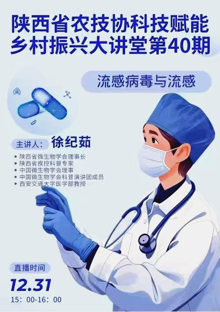 此次直播課是“陜西省農技協(xié)科技賦能鄉(xiāng)村振興大講堂”的第40期,由陜西省科學技術協(xié)會主辦,陜西省微生物學會等3家單位承辦。直播課上,徐教授用通俗易懂的語言,生動講解了流感病毒的病原生物學特點、類型、傳染性和抵抗力等健康知識,以生活案例為切入點詳細闡釋了流感的臨床表現(xiàn)、病原、高發(fā)季節(jié)、傳播途徑、致病致死率、潛伏期、流行史等內容,告訴大家發(fā)熱不適時如何自我判斷、如何正確用藥就醫(yī),引導大家通過及時接種疫苗、科學佩戴口罩、保障充足睡眠、遠離密集場所、加強運動鍛煉等方式預防流感。