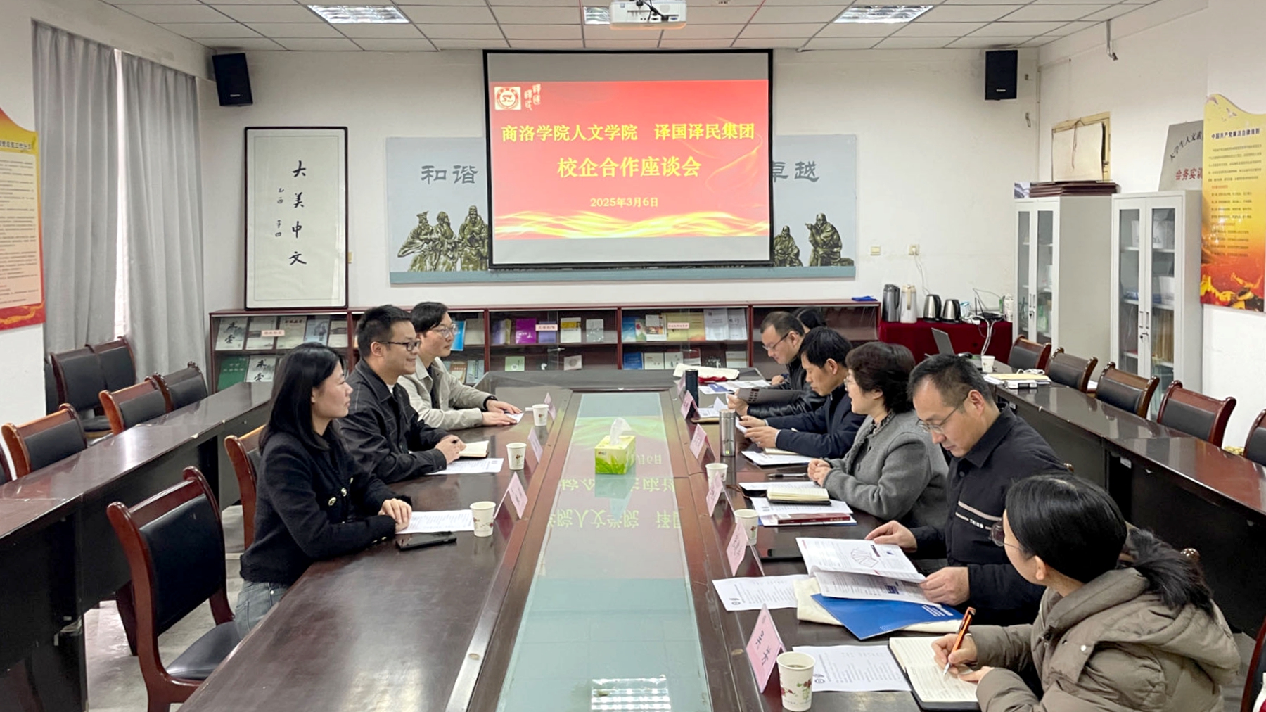 人文學(xué)院黨政主要領(lǐng)導(dǎo)和教師代表,譯國(guó)譯民集團(tuán)西北公司總經(jīng)理吳強(qiáng)及相關(guān)工作人員,學(xué)校國(guó)內(nèi)合作與校友工作處相關(guān)負(fù)責(zé)人及工作人員參加會(huì)議。