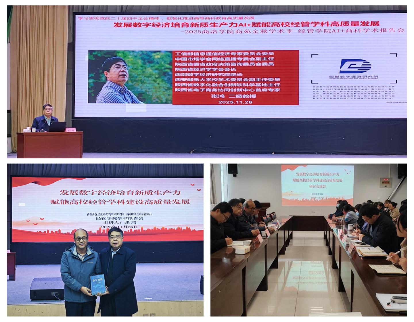 11月26日,經(jīng)濟(jì)管理學(xué)院在大學(xué)生活動(dòng)中心舉辦專題學(xué)術(shù)報(bào)告會(huì),西安郵電大學(xué)張鴻教授應(yīng)邀為學(xué)院師生作《發(fā)展數(shù)字經(jīng)濟(jì)培育新質(zhì)生產(chǎn)力賦能高校經(jīng)管學(xué)科建設(shè)高質(zhì)量發(fā)展》專題報(bào)告。學(xué)院班子成員、全院教職工及2025級(jí)全體學(xué)生參加了報(bào)告會(huì)。