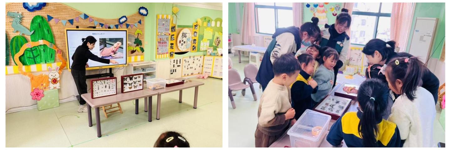 活動中,李麗以“神秘的爬行動物”為切入點,通過生動的語言和直觀的現(xiàn)場展示,向小朋友們介紹了蜥蜴的外形特征、生活習性和生存本領。在昆蟲認知環(huán)節(jié),李麗現(xiàn)場展示了包括蝴蝶、甲蟲、蜻蜓等多種昆蟲標本,并引導小朋友們觀察標本形態(tài)、解答相關問題。小朋友們認真觀察標本、分享感受,現(xiàn)場互動氛圍熱烈。