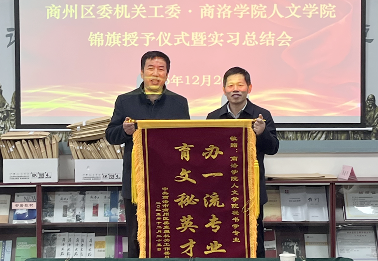 會議伊始,商州區(qū)委機關工委向人文學院授予錦旗,對人文學院秘書學專業(yè)實習生在實踐崗位展現(xiàn)出的專業(yè)素養(yǎng)、務實作風和良好精神風貌表示高度認可與誠摯感謝。金紅衛(wèi)和張文諾分別代表各自單位授旗和接旗。