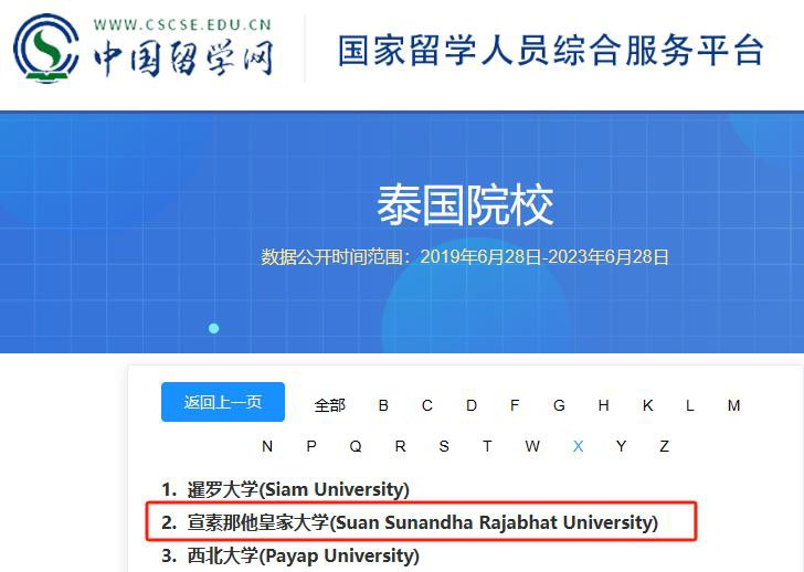 宣素那他皇家大學(Suan Sunandha Rajabhat University)是中國教育部認證、首批推薦泰國重點高校、中國教育部涉外監(jiān)管信息網(wǎng)推薦留學院校。大學設有14個院系以及附屬小學與中學,本科、碩士、博士專業(yè)學位學科120余個,現(xiàn)有全日制在校生29000余名。宣大連續(xù)20年在泰國皇家大學中綜合排名第1位;是教育部留學服務中心戰(zhàn)略合作伙伴,長期與國內(nèi)外多所國際知名院校長期進行學術合作與交流,出席中國-東盟及“一帶一路”教育展、中國國際巡回教育展等。